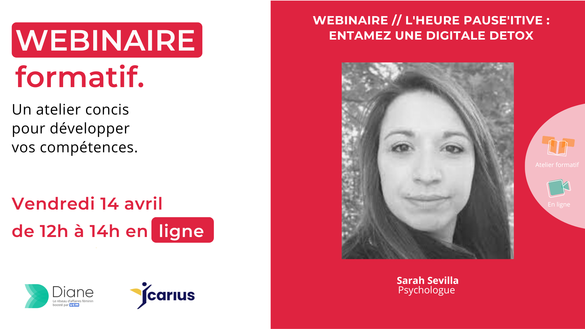 Diane, le réseau d’affaires féminin boosté par UCM vous propose, dans cadre du projet Icarius, un webinaire de 2H pour retrouver une connexion digitale saine et équilibrée.