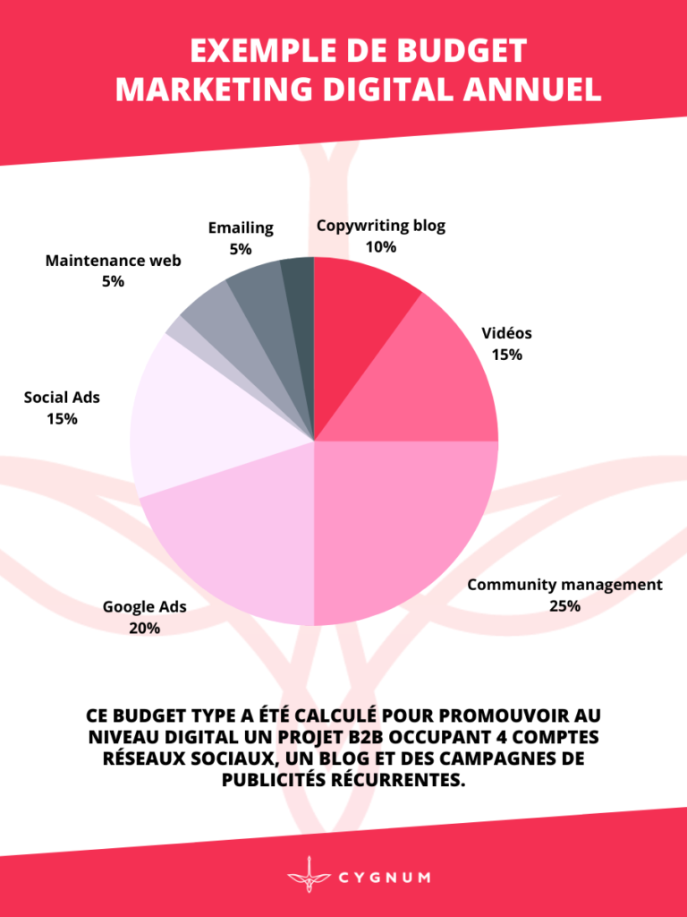Voici un exemple de répartition de budget marketing annuel B2B orienté services :
